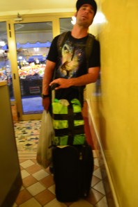 Earlier that day while shopping for provisions in a Verona mega grocery store, our brilliant idea to purchase jumbo bottles of olive oil and a case of Italian wine, which cost about as much as one good bottle in the U.S., made us a hilarious site to onlookers and passersby in Venice. Imagine two tourists each dragging their luggage down an uneven, busy cobblestone street, one of them with several backpacks, including one larger than a small child straddled to the front of her (that would be me), while the other has a gigantic mystery box wrapped in a reusable grocery bag and secured with Gorilla tape to his roller-board luggage (Randy). Luckily our hotel was only a few blocks from the train station.