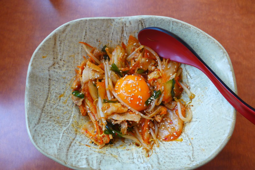 Now for a quick lunch break at a Shibuya eatery: Pork with kimchi and egg.