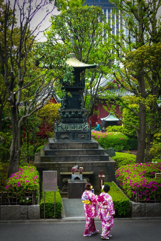 The gardens of Senso-ji and Japanese women donned in kimonos, embracing Japanese tradition.